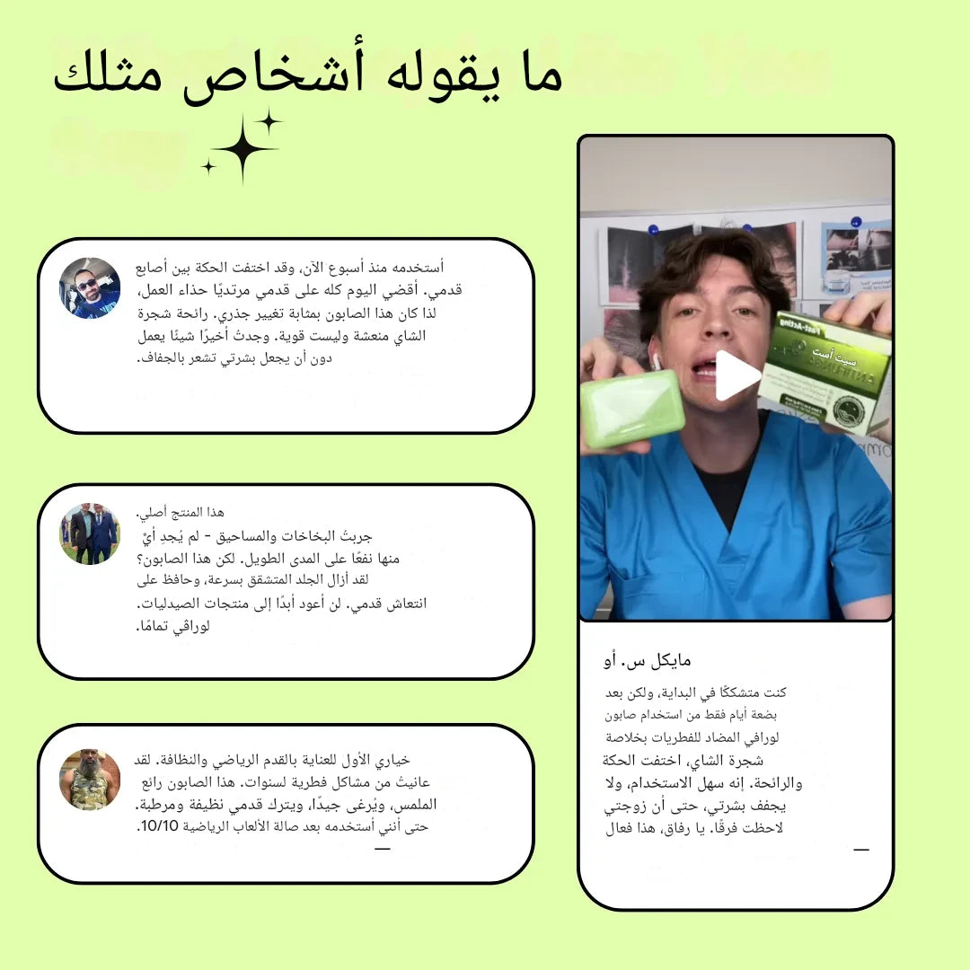 من السهل فهم سبب اختيار آلاف الأشخاص الذين يعانون من مرض قدم الرياضي المزمن لصابون زيت شجرة الشاي لدينا بدلًا من العلاجات المؤقتة التي قد تفشل. صُممت كل قطعة لقتل الفطريات تمامًا ومنع عودة العدوى التي تُشعرك بالخجل، مما يمنحك الثقة لعيش حياة طبيعية مجددًا.